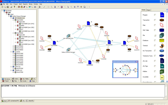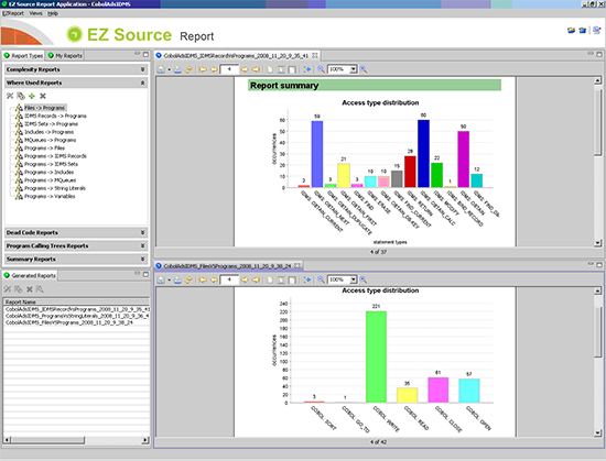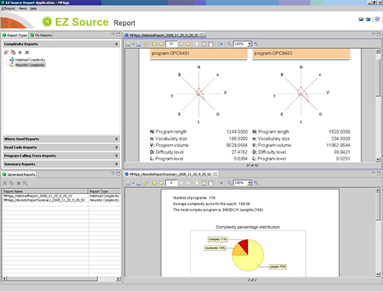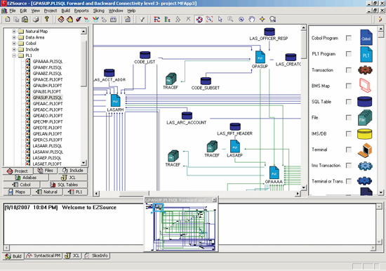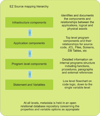 EZ Source Application Mapping: Underpinning Enterprise Application Management | EZ Source fully automates Application analysis, documentation and measurement, helping organisations with the real world problem of managing their existing Application portfolio. EZ Source correlates the relationships between the different Application components and interfaces, automating the production of technical documentation. It operates across multiple languages and environments, producing consistent understanding and measurement. Through its ability to parse the different Application components (for example, source code, OS scripts, include files, screen maps, transactions, messaging system data, Application servers data, etc) and then visualise the internal Application structure and dependencies, users can select their starting point to navigate across or drill down as required in order to precisely determine the scope and level of analysis. | This Application CMDB functionality is complemented by a rich choice of visualisation and reporting options so users can precisely define the scope and depth. Many different options are provided to visualise the analysis according to requirements and results. For example, a particular analysis may reveal complex interdependencies with different types of components, so EZ Source has user definable dependency levels, filtering and visualisation layouts in order to achieve optimum understanding. | In all stages in the analysis, EZ Source synchronises with the source code so developers can understand exactly how functions are performed. In addition to this internal analysis, EZ Source also includes database and interface components so that the understanding can include these vital aspects as well as starting from these points of view. If conducted manually, it is difficult to identify even straightforward questions such as "where is this database table used?", or "where is MQ integrated into my Application?" EZ Source provides these complete results in seconds. | An additional option is a comprehensive reporting portal used to measure different aspects of the Application. EZ Reports includes both industry standard metrics (e.g. McCabe, Halstead, Function Point) and user defined parameters. Invaluable for Management and Architecture requirements, it allows quality and code standards to be institutionalised into the development and review process. In addition, it also gives developers valuable insights by documenting aspects such as 'where used' and 'dead code' occurrences. All of this functionality provides a one stop shop for understanding and analysis of your Applications. An additional module - EZ Source Enterprise Server - also goes one step further (for mainframe environments) by adding information on the Infrastructure and how the Application performs in production, including such information as identifying transactions, code or control language that has not been used for a period of time, etc. This is invaluable in extending our Applications CMDB information to the logical and physical environment, including automatically mapping the interdependencies, by adding to the Application information additional operational data for optimisation based on actual usage. | EZ Source Integration | Many organisations will have existing infrastructure that is complementary to the EZ Source analysis capabilities. The product therefore provides a wide range of integration options so that EZ Source can be populated, or provide data to be both current in its analysis and add value to other products. Some examples are: ▫ Source Configuration Management Systems - automatically loading and propagating changes when they occur ▫ Planning - export of Applications metrics to Excel for work planning and estimation ▫ EZ Source API - exporting data from the EZ Source repository to other systems such as Enterprise CMDB | EZ Source visualization and navigation option | EZ Source provides a rich variety of options to display, filter and analyse an application. According to the task at hand, the user can readily identify both the overall landscape or choose an identified starting point, track the internal relationships as appropriate and analyse through a wide variety of filtering options. In addition to these graphical options there is a comprehensive suite of configurable reports available as well as open access into the open SQL repository. At any stage, synchronization is provided to the Source Code. Comprehensive search, impact analysis and 'where used' capabilities exist to assist with precise assessment and understanding. |  EZ Source visualization and navigation option | EZ Source also allows for integration with external third party applications and our Repository, for example Excel in numerical analysis and Visio for documentation. The EZ Source navigation hierarchy and the detailed components can be described as follows: |  Supported environments | 1. OS - MVS, OS/390, z/OS, VSE, Fujitsu AIM, AS/400, Unix, Linux, Windows 2. Languages - Cobol, Natural, PL/1, CA-ADS, REXX, Assembler, Java 3. DB - DB2, IMS/DB, AIM/DB, ADABAS, VSAM, CA-IDMS/DB, DB 400 4. TP Monitors - CICS, IMS/DC, AIM/DC, CA-IDMS/DC 5. Messaging - MQ 6. Batch - Control M 7. ERP - SAP R/3, ECC 5.0, ECC 6.0, ABAP | Many organizations will have existing infrastructure that is complementary to the EZ Source analysis capabilities. The product therefore provides a wide range of integration options so that EZ Source can be populated, or provide data to be both current in its analysis and add value to other products. Some examples are: - Source Configuration Management Systems - automatically loading and propagating changes when they occur - Planning - export of Applications metrics to Excel for work planning and estimation - EZ Source API - exporting data from the EZ Source repository to other systems such as Enterprise CMDB EZ Source Enterprise Server bridges the gap between applications and operations, allowing appli