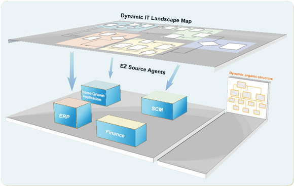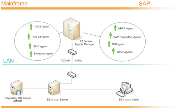 | | The EZ Source Enterprise Server is the addition of the mainframe agents to EZ Source Application Mapping, connecting operations, frameworks and application environments, providing a complete IT Landscape mapping. The agents map the current operational landscape and the mainframe infrastructure (Sysplex, Lpar, DADS, CPU, libraries, etc.), linking the actual IT assets and application components to their physical location and resource consumption. All the information collected by the agents is stored into the EZ Source relational database repository. Each change of the environment, infrastructure or applications is replicated in the repository and notifications are provided accordingly. | The updated repository allows for real-time data synchronization that enables data consistency and accuracy among distributed instances of the same mainframe-based information. Sources are accessed directly in a read-only mode, saving the need to constantly ftp the sources off the mainframe. Enterprise IT assets mapping input includes: ▫ Mainframe Infrastructure ▫ Performance information ▫ Application source code ▫ OS data and batch information ▫ Additional system definitions EZ Source Enterprise Server operations-to-applications data is presented in a well-organized, coherent and up-to-date manner, relevant for both your application and operations teams. The information provided can help reducing maintenance and operational costs, meeting SLAs and providing a clear up-to-date IT landscape view to the CIO and IT management. | |